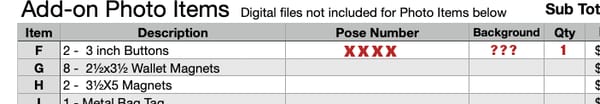 To order Item-I at Photo Day Session. Go to line 'I' on Order Form, enter the Pose number the red XXXX are then the background number where the ???'s are and quantity. I - 2 Buttons