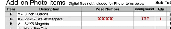 To order Item-G, 8 Wallet Magnets, go to line 'G' on Order Form, enter your favorite Pose number in location of red XXXX , enter selected background number where the ???'s are and quantity.